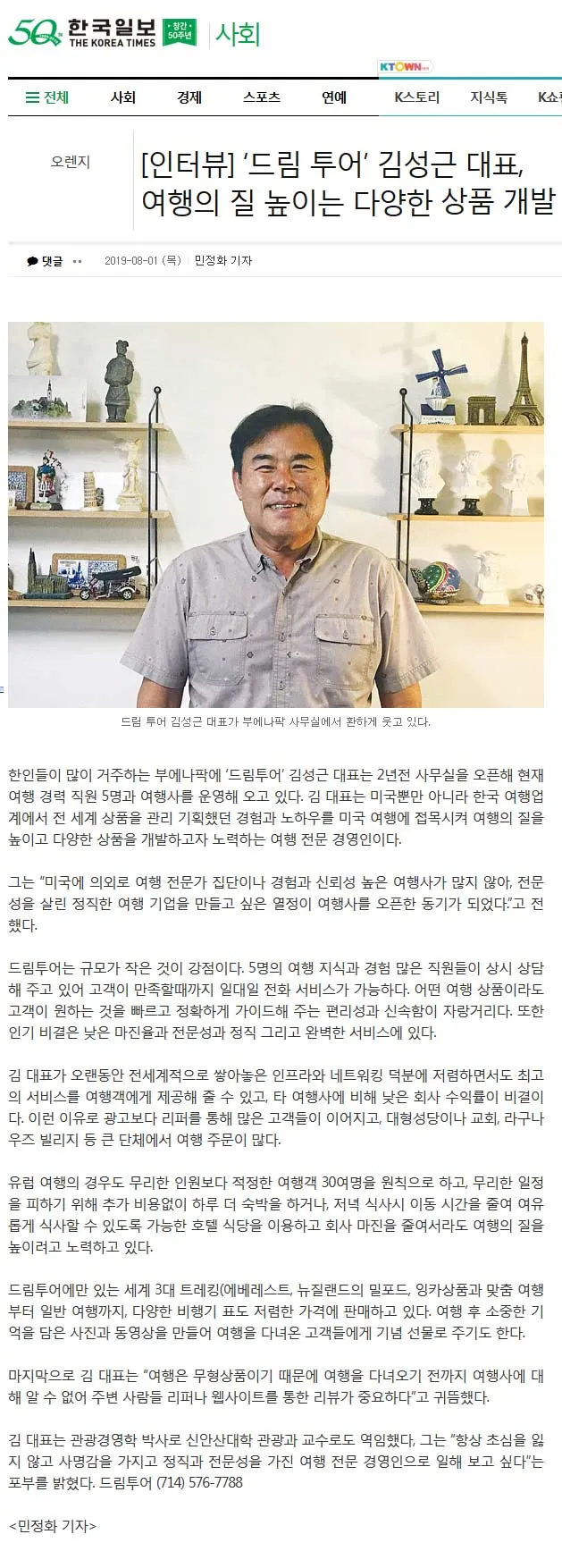 • [인터뷰] ‘드림 투어’ 김성근 대표, 여행의 질 높이는 다양한 상품 개발 - 한국일보 8월 1일
